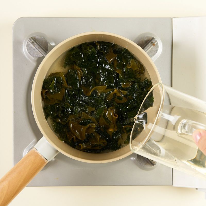 중불로 예열한 냄비에 식용유를 두르고 미역과 미역귀를 넣어 볶다가 표면의 수분이 모두 사라지면 물(500ml)과 연두순을 넣어 센불로 끓여 주세요.