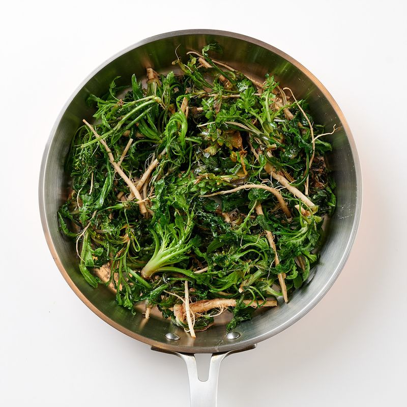 2. 팬에 연기가 날 정도로 센 불에서 기름과 함께 냉이를 볶아야, 냉이 특유의 고소한 맛, 감칠맛, 해산물(오징어)과 같은 복합 풍미가 상승해요.