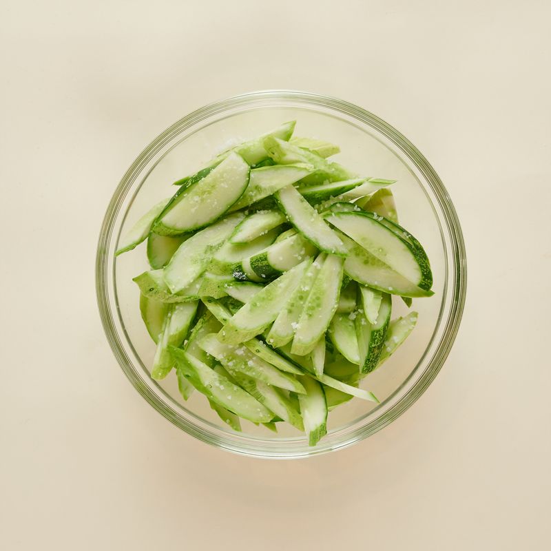 굵은 소금 1스푼과 썰은 오이를 버무려주고 5분 동안 놔둬 절여 주세요. 오이에서 나온 수분은 체에 밭쳐 제거해 주세요.