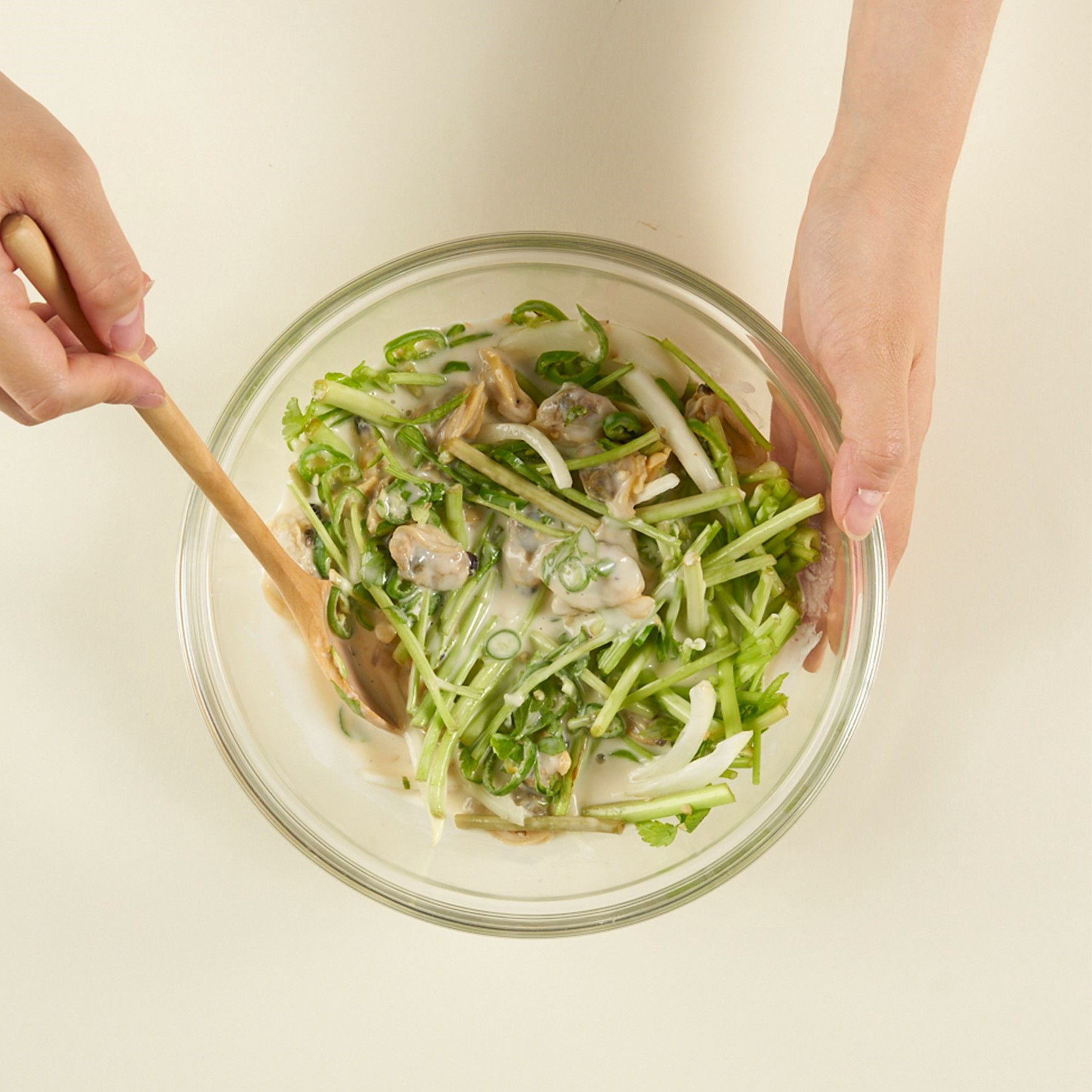 손질한 채소에 중력분, 물, 바지락살, 연두순을 넣어 전 반죽을 만들어주세요.