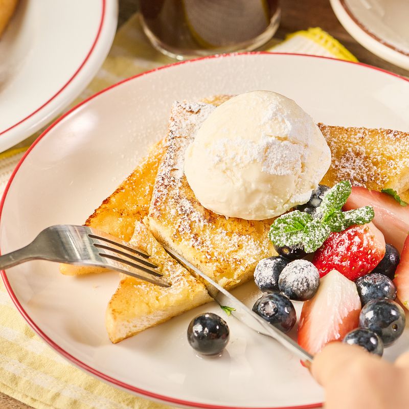 토스트를 접시에 담아 과일, 크림 등 원하는 재료와 함께 곁들이면 완성!