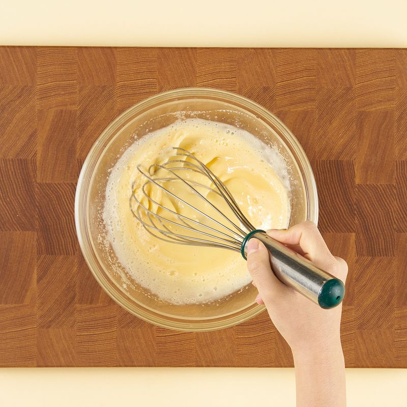 볼에 달걀, 우유, 설탕을 넣고, 설탕이 녹을 때까지 휘퍼를 이용하여 섞어 주세요. 달걀물에 식빵을 넣고, 앞 뒷면을 뒤집어가며 묻혀주세요. (한 면당 약 30초~1분간)
