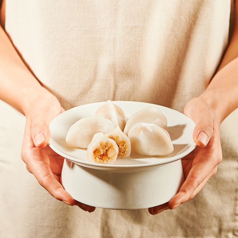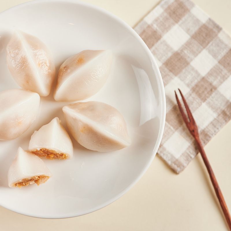 완성된 송편 반죽에 병아리콩 소를 넣어 송편을 빚어주세요. (20개 가량)