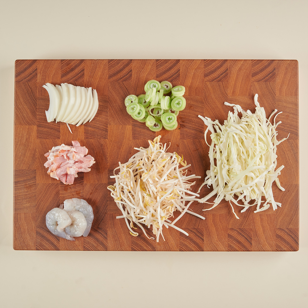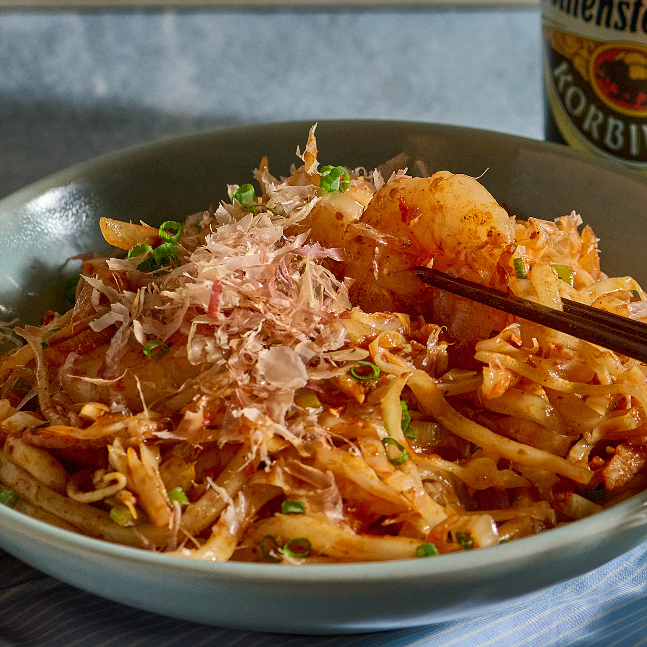 마지막으로 새우와 볶아둔 채소(양파, 양배추, 숙주), 삶아둔 우동면을 넣고 1분 동안 함께 볶아주면 완성!