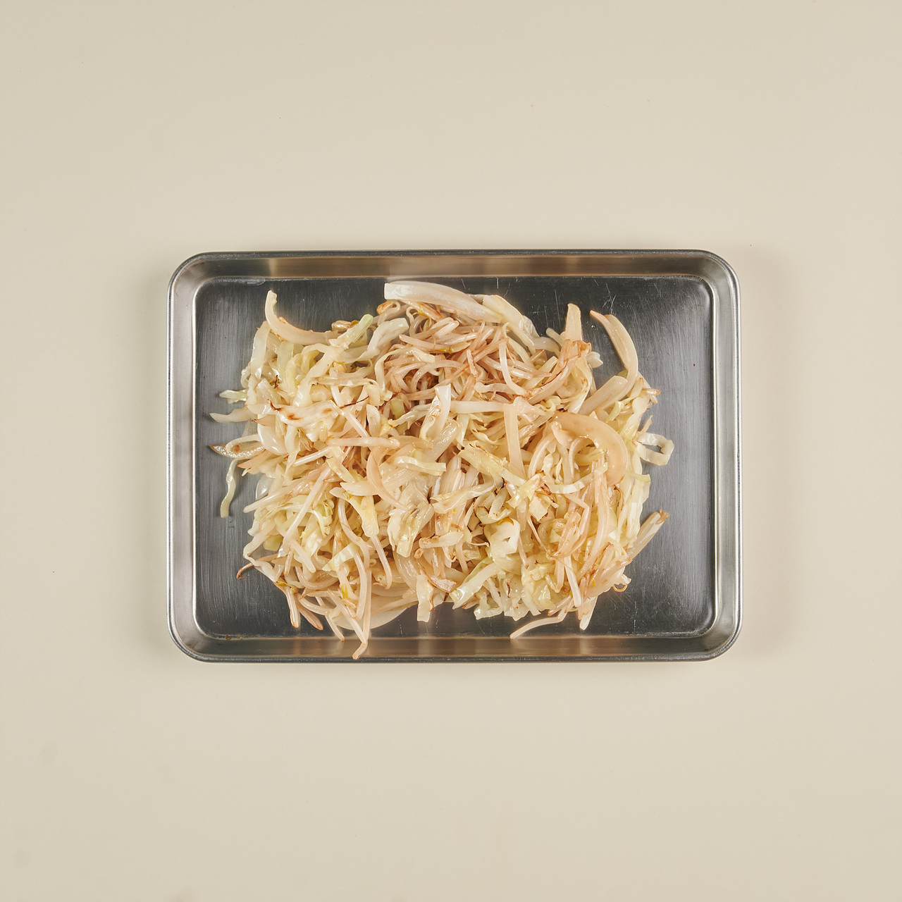팬을 센불로 1분간 예열한 후, 식용유 2스푼을 먼저 둘러주세요. 양파, 양배추, 숙주를 센불로 1분 동안 빠르게 볶은 다음 그릇에 잠시 덜어두세요.