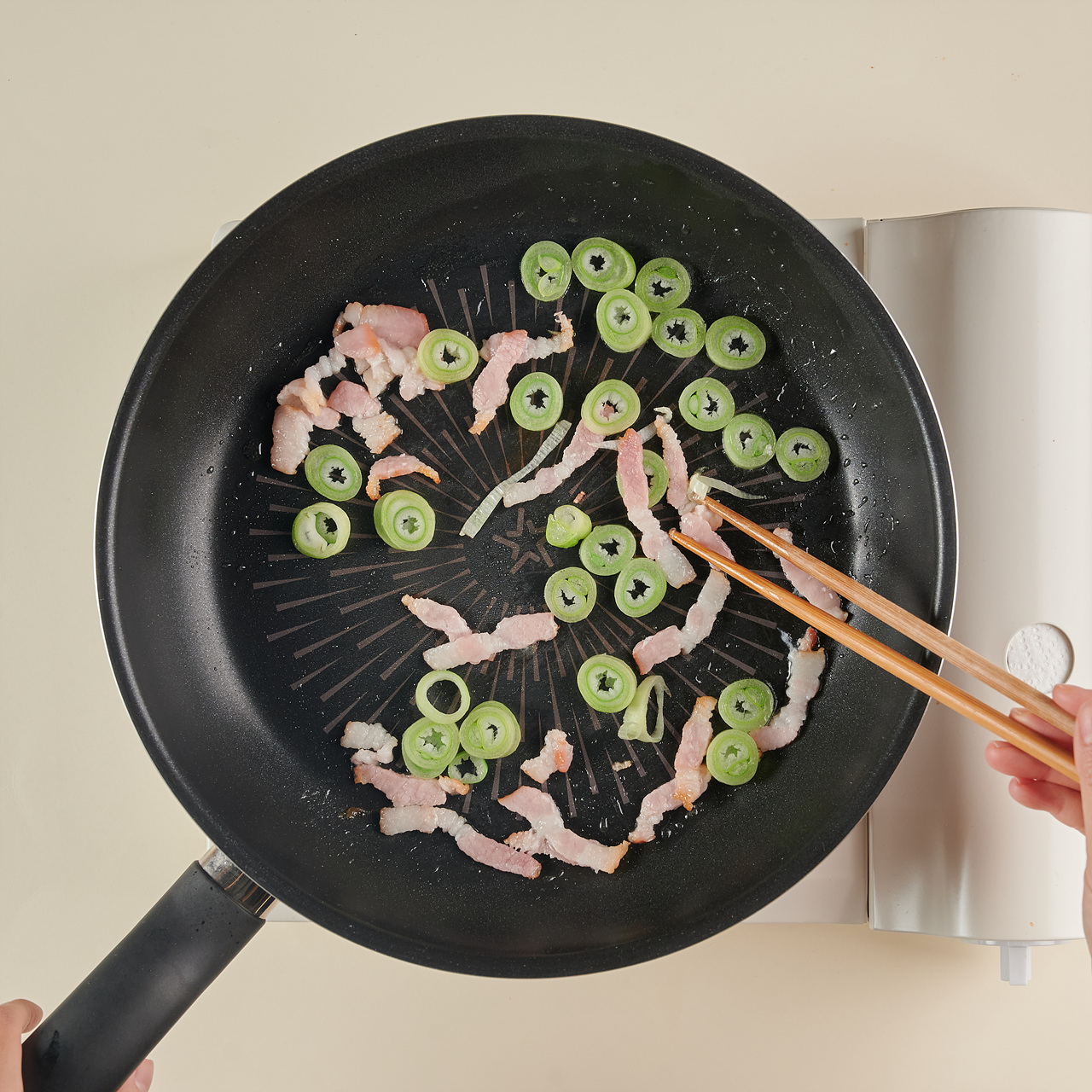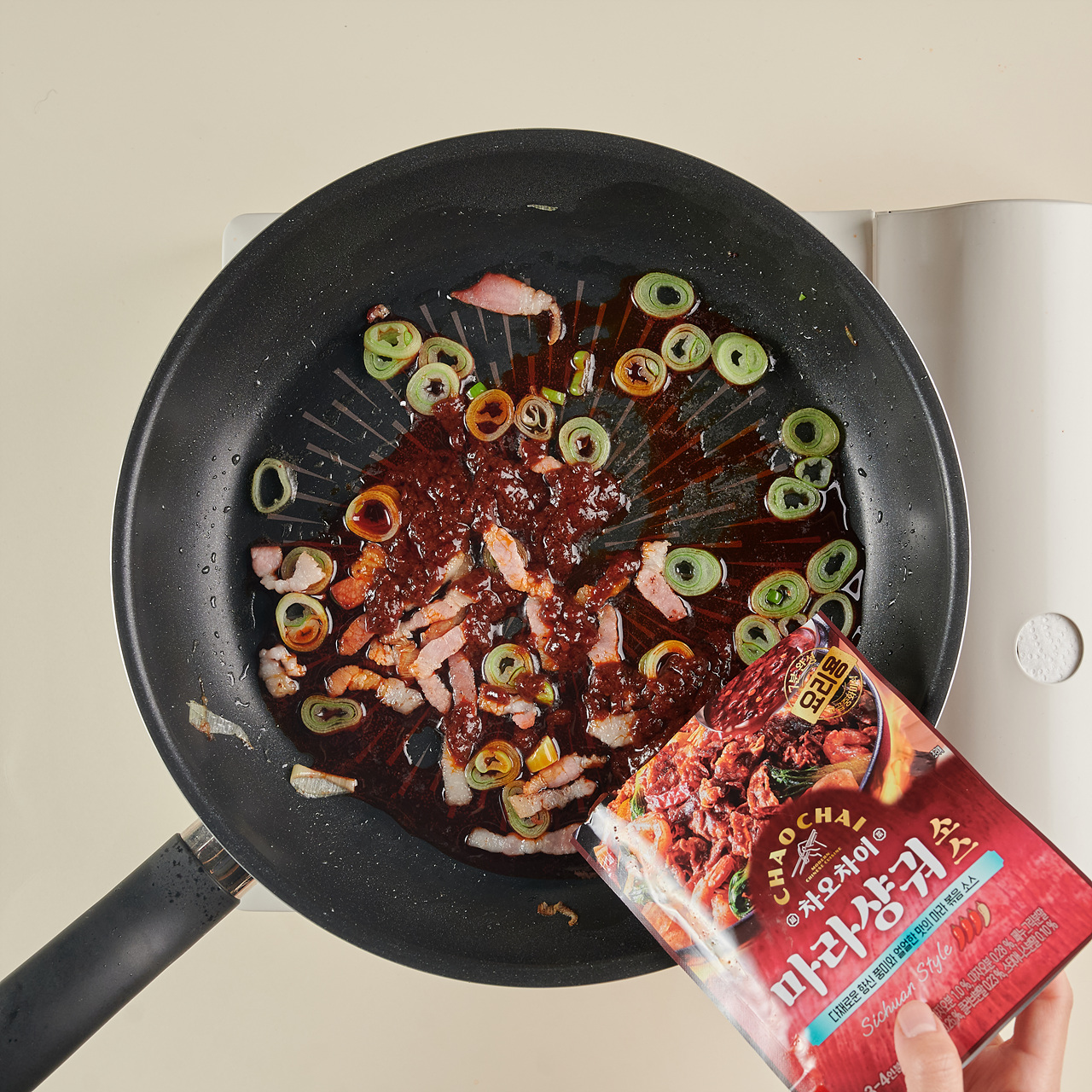 채소를 볶은 팬에 식용유 1스푼과 베이컨, 대파를 넣어 베이컨이 노릇노릇해질 때까지 볶아 주세요. 그 다음 연두진과 마라샹궈소스를 넣어주세요.