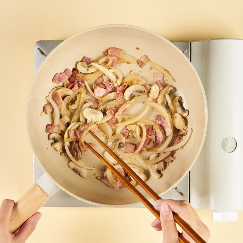 베이컨이나 버섯 등 내가 원하는 재료 볶다가