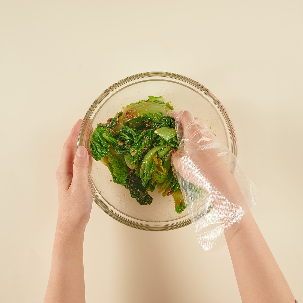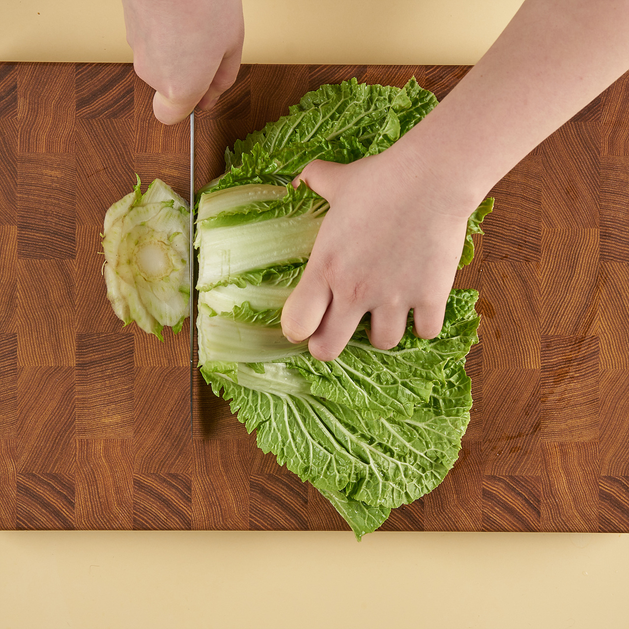 봄동 겉면의 큰 잎(초록색)은 2-3cm 크기로 썰고,작은 속잎(안쪽의 노란색 잎)은 썰지 않고 그대로 사용해 주세요.