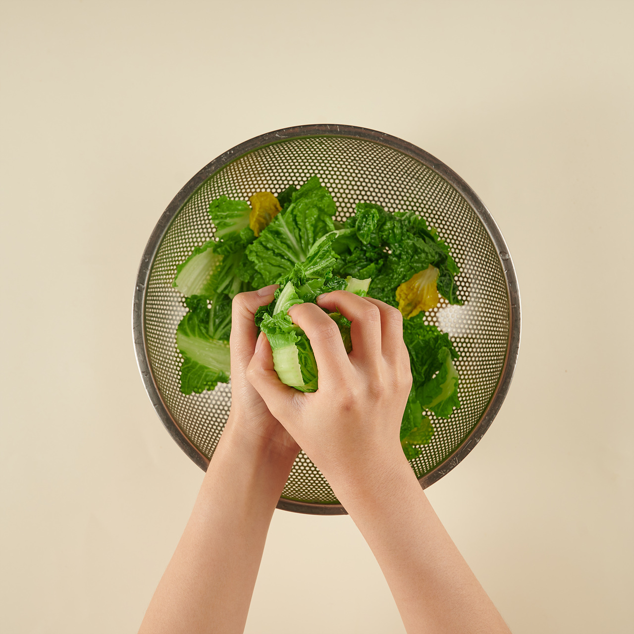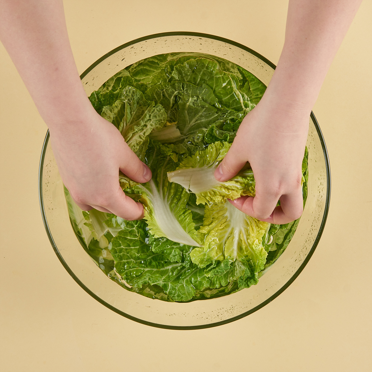 봄동은 반으로 접어 뒤집어 밑동(고갱) 부분을 잘라내고한 장씩 떼어 내 흐르는 물에 여러 번 깨끗이 씻어주세요.