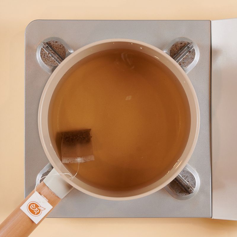 물과 보리차 티백을 냄비에 넣고 끓여 주세요. 물이 끓어 오르면 불을 끄고 30분 동안 티백을 우려내서 보리차 물을 준비해 주세요.