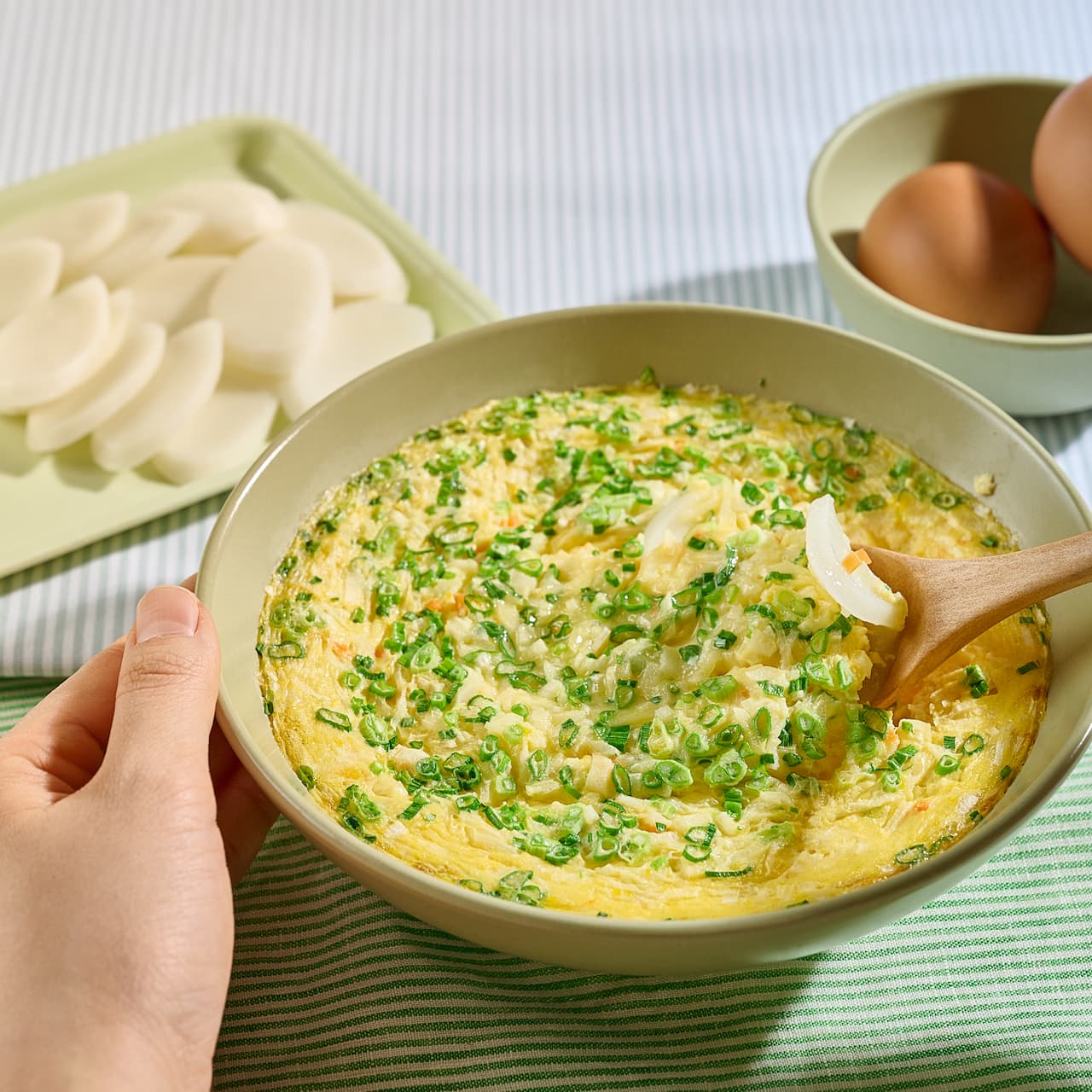 내열 용기에 떡을 먼저 넣은 후, 그 위에 잘 섞은 달걀물을 부어주세요. 전자레인지에 6분간 조리하면 완성! (1,000W 기준)