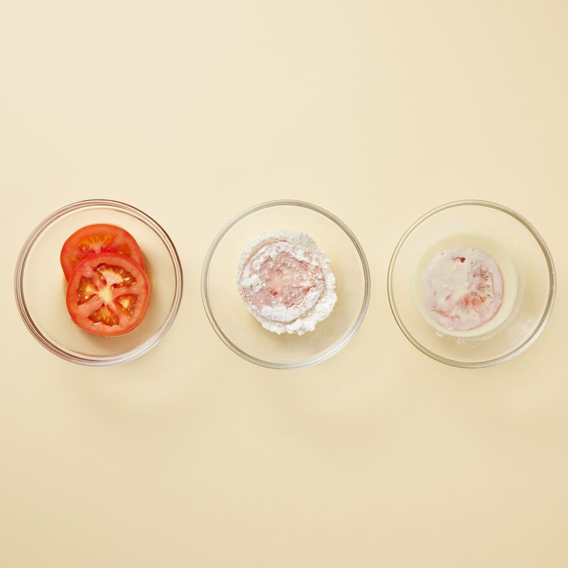 썬 토마토는 (1) 연두 → (2) 밀가루 2스푼 → (3) 반죽(밀가루 2스푼 + 물 5스푼) 순서대로 묻혀주세요.