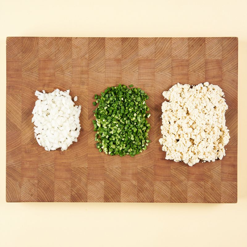 두부는 키친타올 혹은 면보를 이용하여 물기를 제거하고, 칼 등이나 포크로 곱게 으깨주세요. 양파 0.5cm 크기로 다져주고, 부추는 0.5cm 길이로 송송 썰어주세요.