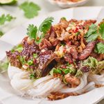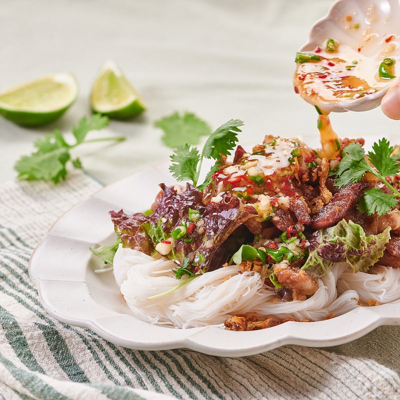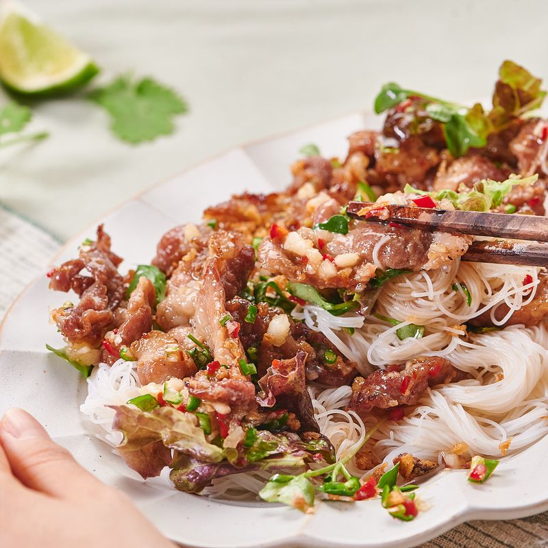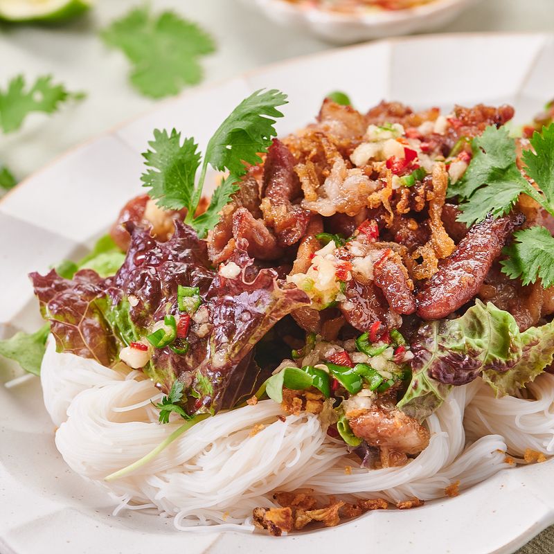얇은 쌀국수면에 바싹 구운 돼지고기를