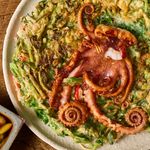 낙지를 제외한 반죽을 절반 붓고, 낙지 몸통이 가운데 & 다리가 바깥쪽으로 펼쳐지도록 따로 올려 부쳐주세요. (전 1개당 낙지 1개)