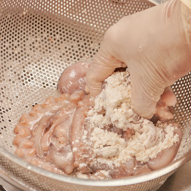 손질된 낙지는 체 위에 올려 밀가루 2스푼을 넣고 빨판 사이사이를 밀가루와 함께 손으로 문질러 닦은 후, 흐르는 물로 헹궈주세요.