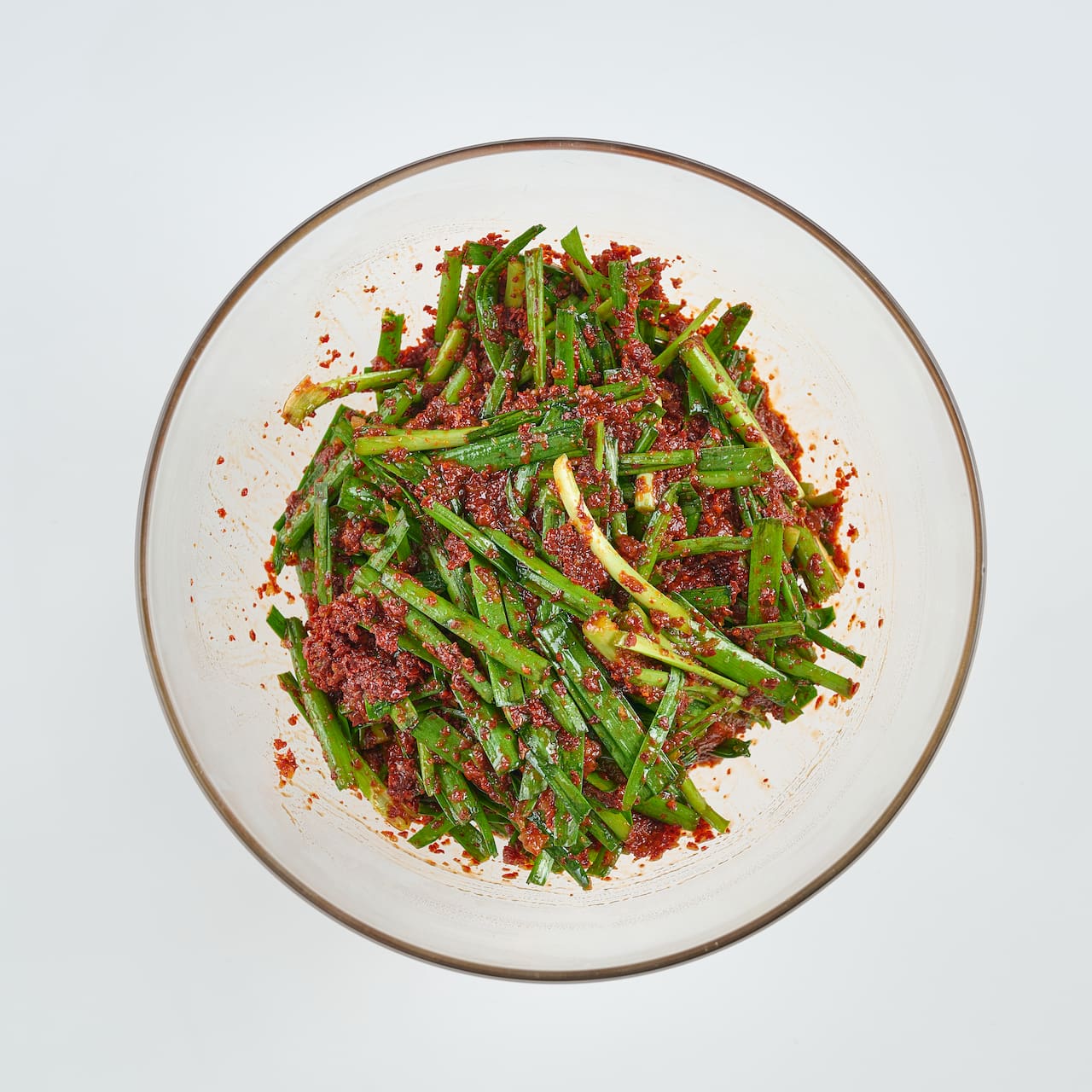 부추는 2-3cm 길이로 썰어주세요. 새미네 오이소박이 양념과 부추, 고춧가루를 넣고 잘 섞어주세요.