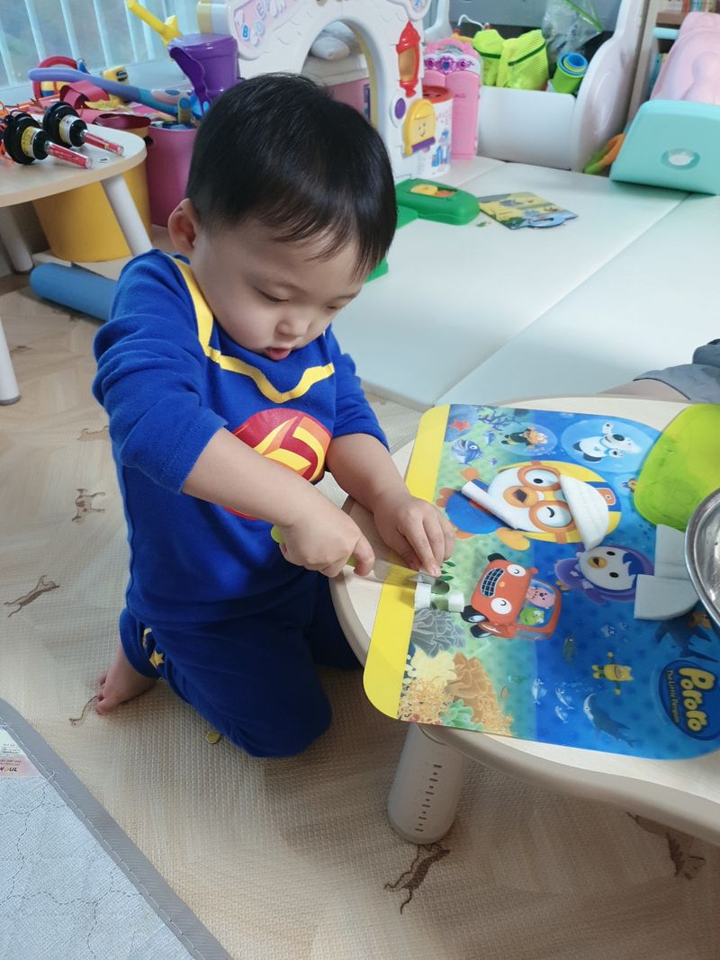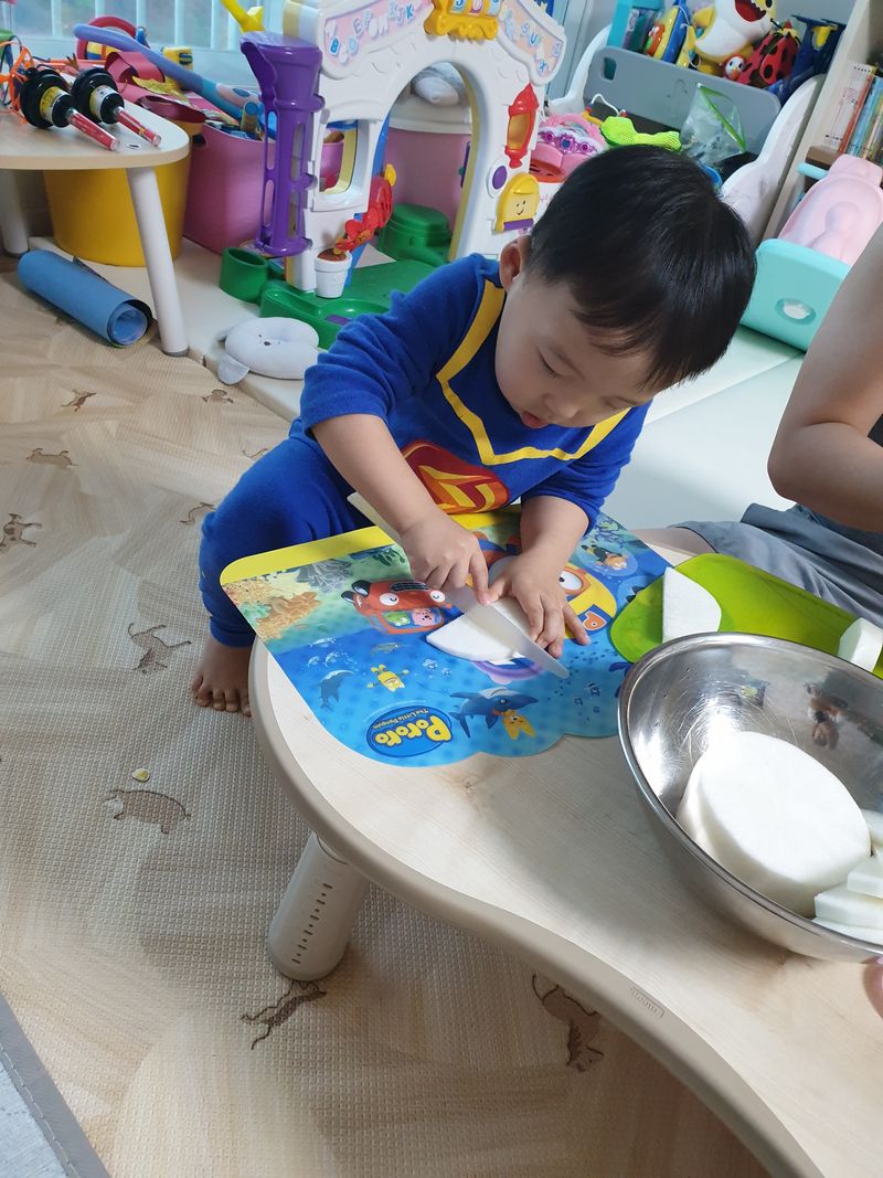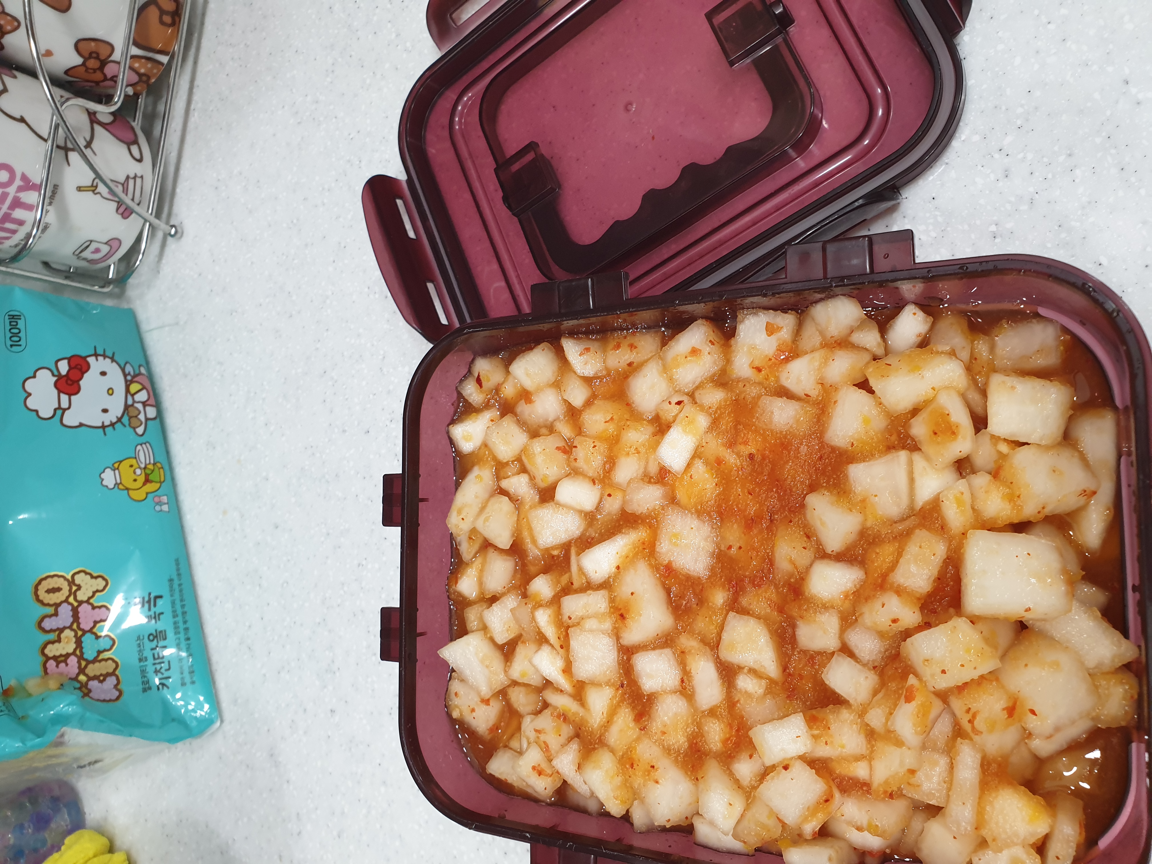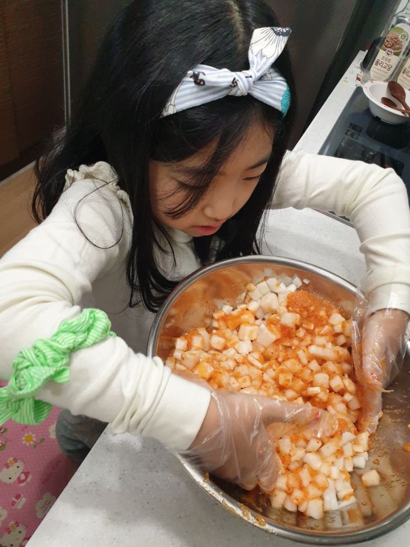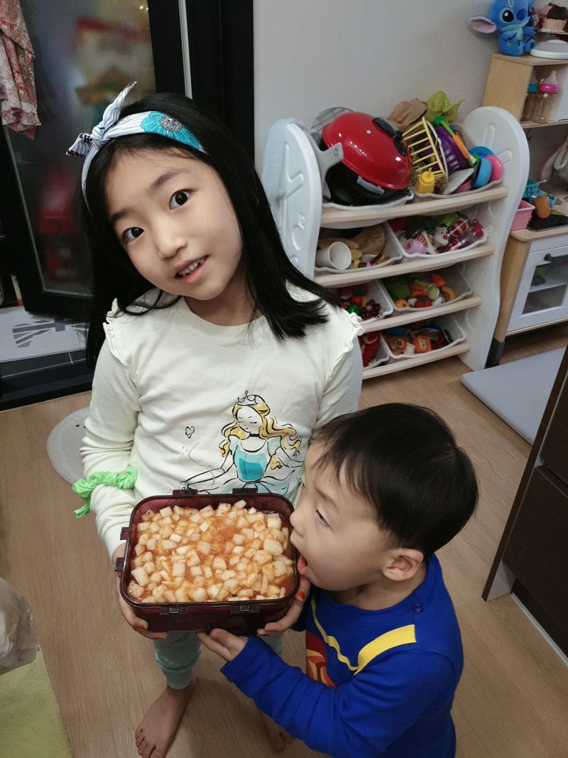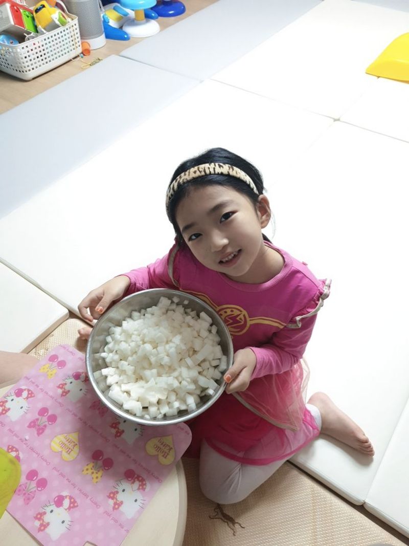 7살 첫째와 3살 둘째가 김치를 못 먹어서 안 매운 무김치를 만들었어요. 빨간색이면 다 매울꺼라는 편견을 버리는 계기가되었어요.^^ 같이 만들고 맛을 보다 보니까 친해지게된 깍두기 ~!