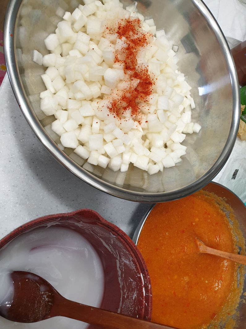 재료 : 무 파프리카 배 양파 매실청 설탕 소금 고춧가루 찹쌀풀