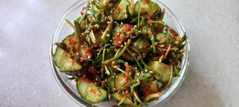 두 번째는 마침 냉장고에 잠자고 있던 오이를 꺼내서 씻고 썰어서 십자로 칼집을 내준 다음, 부추를 고춧가루와 새미네 오이소박이 양념을 부어 조물조물 한 다음 오이 속에 넣어 주면 끝~