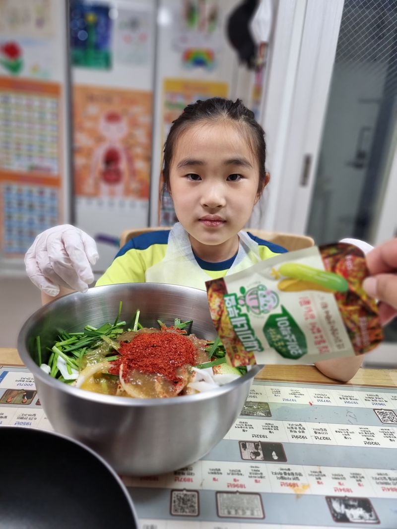 오이 썰고 부추 넣고 고추가루와 마지막 샘표 오이소박이양념까지 야무지게 넣고 쓱쓱 비벼비벼~^^ 아이들 신나는 모습에 엄마인 저도 즐거웠어요!!