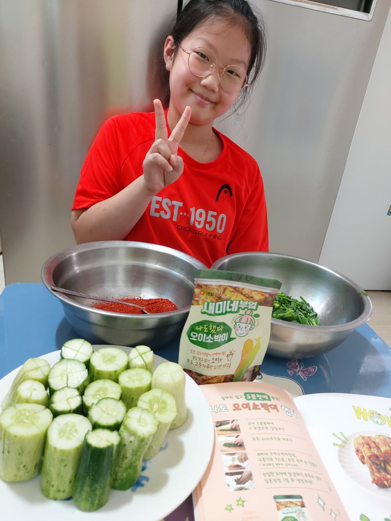 세 딸중에 둘째예요^^ 야채, 고기 등 모든 음식을 편식없이 먹는 둘째는, 요리하는 것도 아주 좋아해요. 새미 덕분에 오이소박이 뚝딱^^