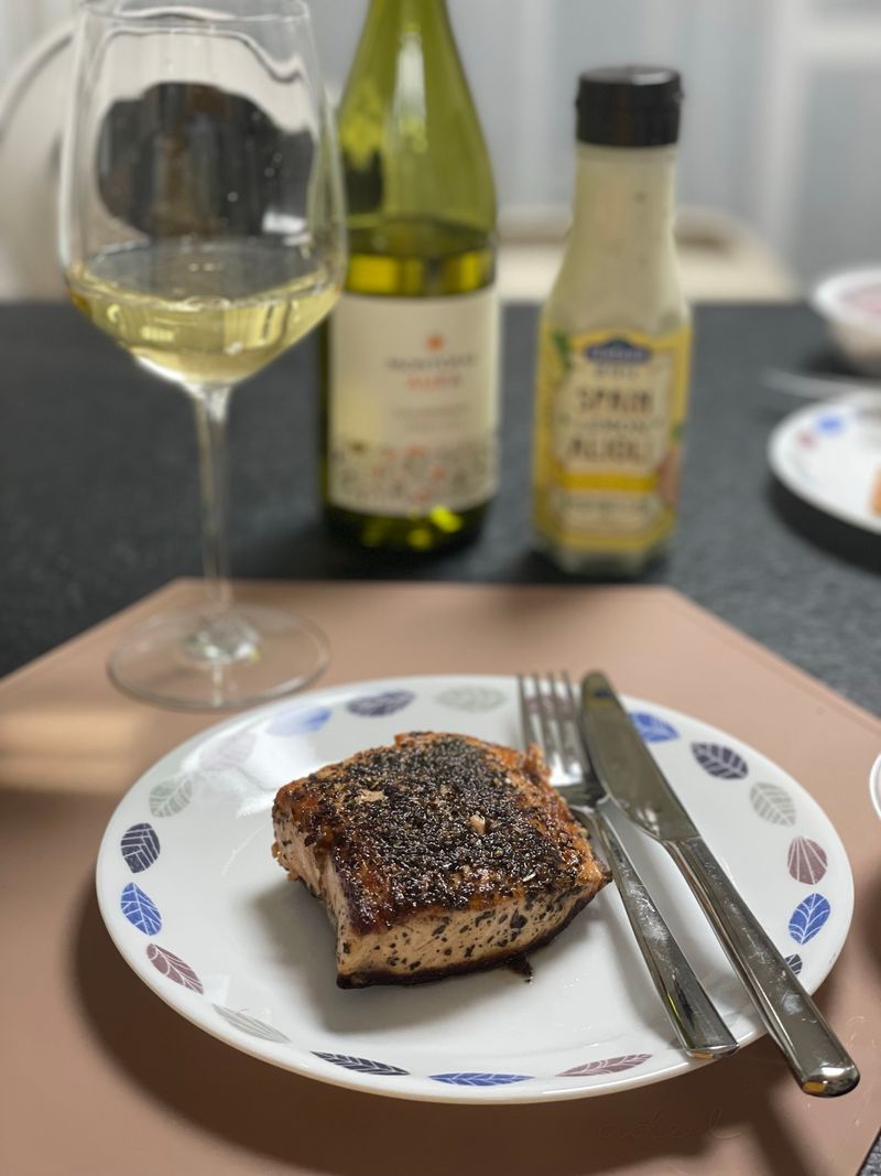 남편이 만들어준 연어 스테이크입니다 💕😆🥰 횟감으로 만들어서 더 부드러워요! 바질&후추 콤보로 냠냠 합니다
