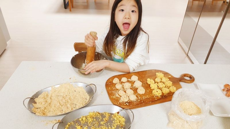 입짧은 우리 아이는 늘 조금씩 먹어 걱정이지만~ 좋아하는 요리를 함께하면 더욱더 잘먹어요~ 아빠와 함께 좋아하는 인절미를 만들어보았어요 찹쌀을 쪄서 쿵덕쿵 반죽을 만들고 좋아하는 카스테라 가루와 콩가루를 묻혀주니 너무나 좋아하고 잘먹는답니다^^