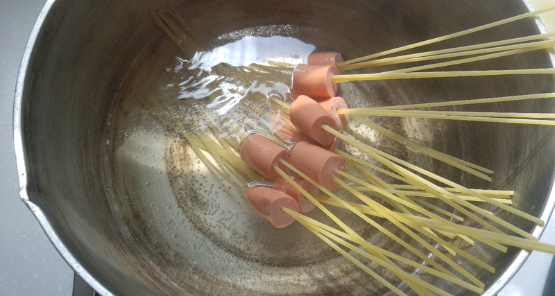소시지에 파스타 면을 꿰어 면만 삶아 토마토 소스만 곁들이면 완성! 간단하면서도 맛있고 아이와 함께 만들기도 좋은 파스타더라구요^^