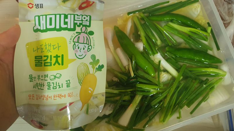 여름대비 물김치 담았어요 생애 첫 물김치~^^ 라면이랑도 고구마랑 먹는거 좋아하는데요 ㅎ 상온에서 이틀 숙성 기다리는중 맛있어져라 맛있어져랏 전 매콤한거 좋아해서 청양고추도 넣었어요♡