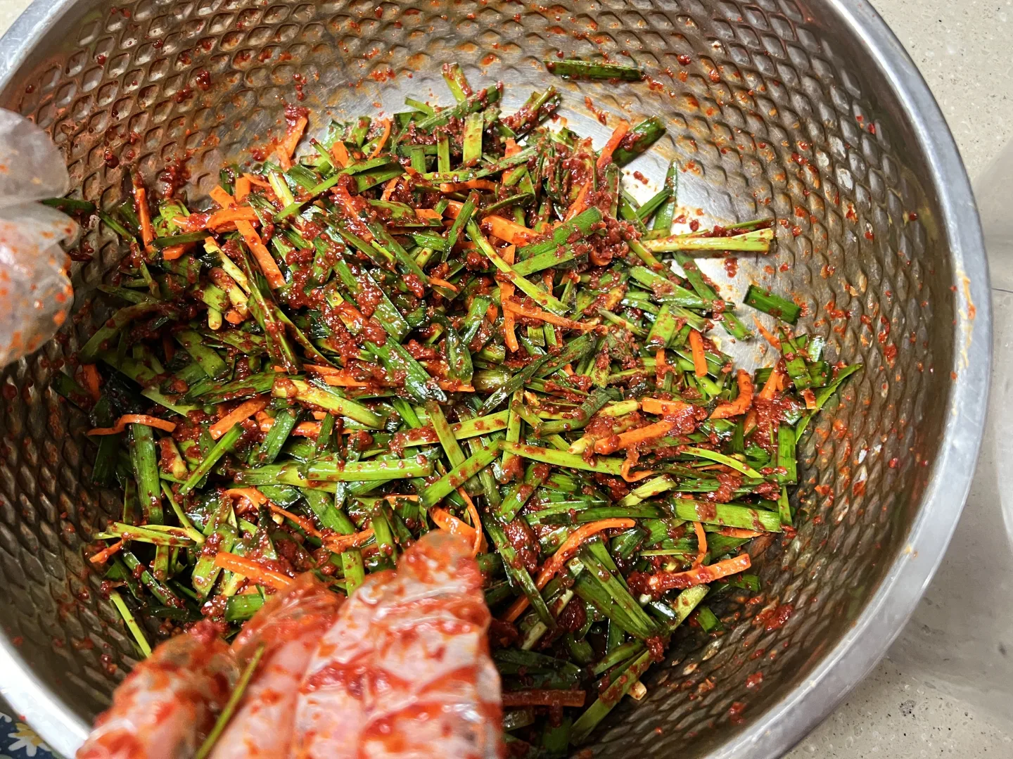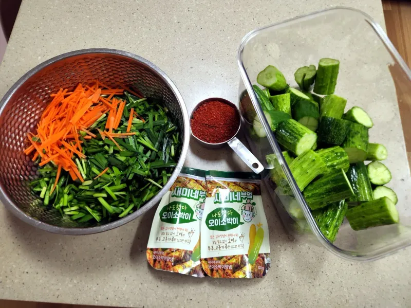 3. 새 미네 오이소박이 양념, 오이, 부추, 고춧가루 넣고 버무리기