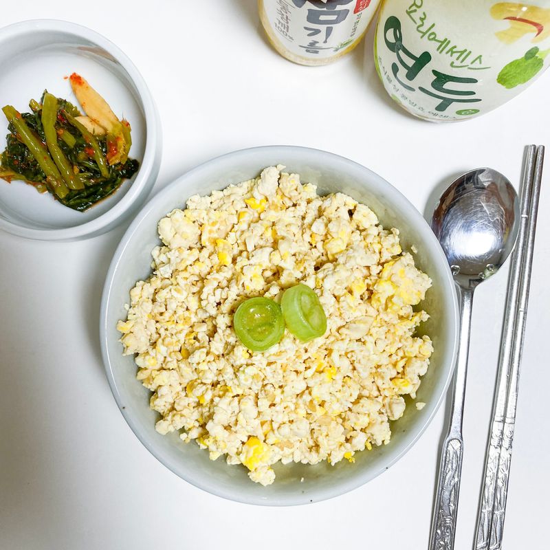 두부는 포크로만 눌러서 으깼어요 두부의 각진 형태만 없앤다는 느낌으로 살살 으깼구요 살짝 기름 두른 팬에서 볶다보면 두부가 동글동글 하게 수분이 날아가며 작게 뭉쳐지거든요 그때 다른 간 필요없이 연두를 좀 넣어주시면 되요 이때 미리 풀어둔 달걀이랑 밥도 함께 넣어서 볶아주시는게 요리법 연구소의 레시피예요