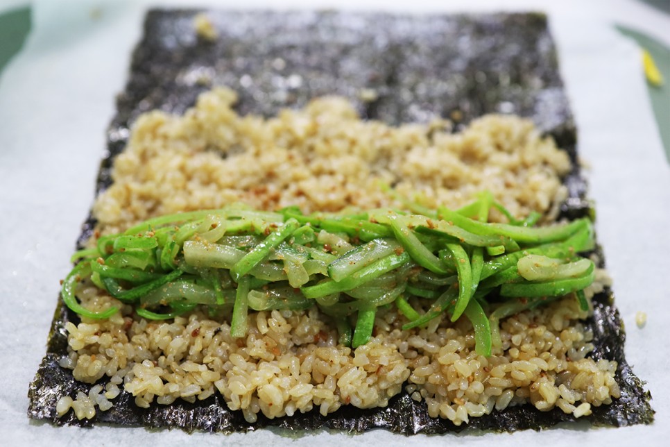 3. 김 위에 밥을 깔고 그 위에 오이무침을 올린 후 말아주세요.
