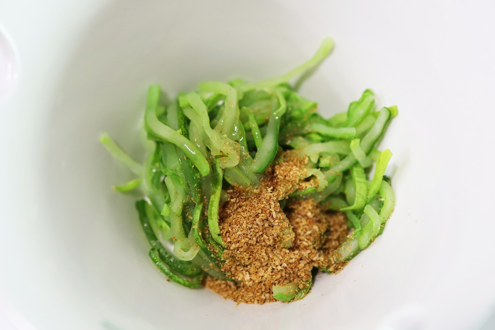 1. 오이를 어슷썰어 끓는 물에 20초간 데친 후 찬물에 헹궈 물기를 제거해주세요.