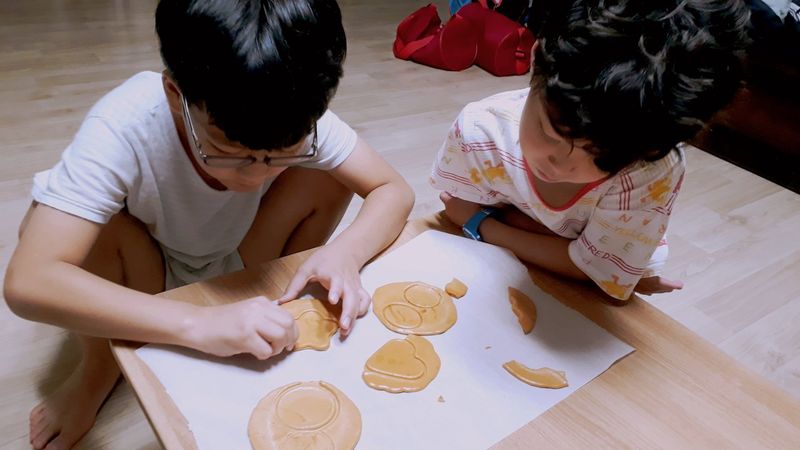 오징어게임으로 한바탕 인기몰이한 달고나 만들기! 급한데로 국자에 슈퍼에서 급히 사온 소다로 신나게 만들고 주먹밥 틀로 모양 찍기! 쉽게 도전하지 못하고 형아 성공을 기원하며 바라보는 동생~~~ 온 집안에 단내가 풀풀~~~~^^