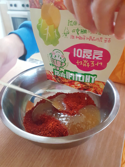 1. 먼저어, 고춧가루와 겉절이 소스를 섞는다. (소스는 의외로 안이 노란색이다!?!)