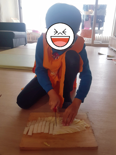 바닥에 도마와 어린이용 칼을 준비하고...곰곰아, 너는 썰거라. (나는 사진 찍을게)