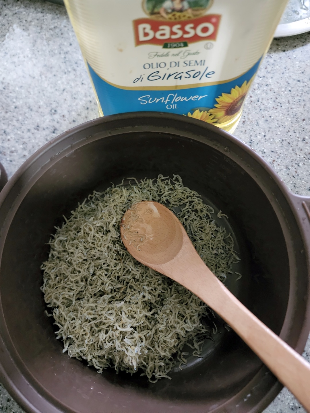 먼저 전자레인지 그릇에 멸치와 포도씨유를 넣고
