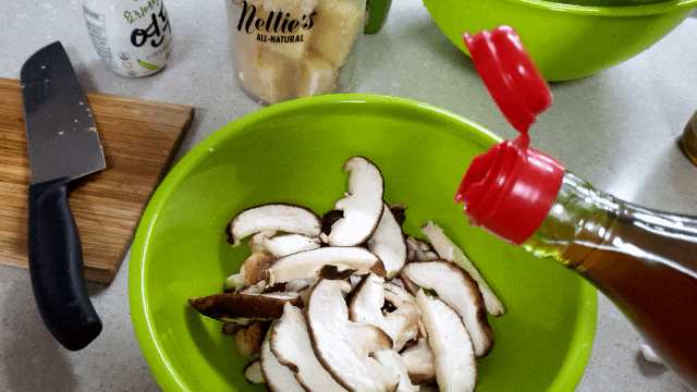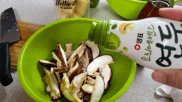표고버섯. 연두 순 에센스. 다진마늘. 참기름. 깨