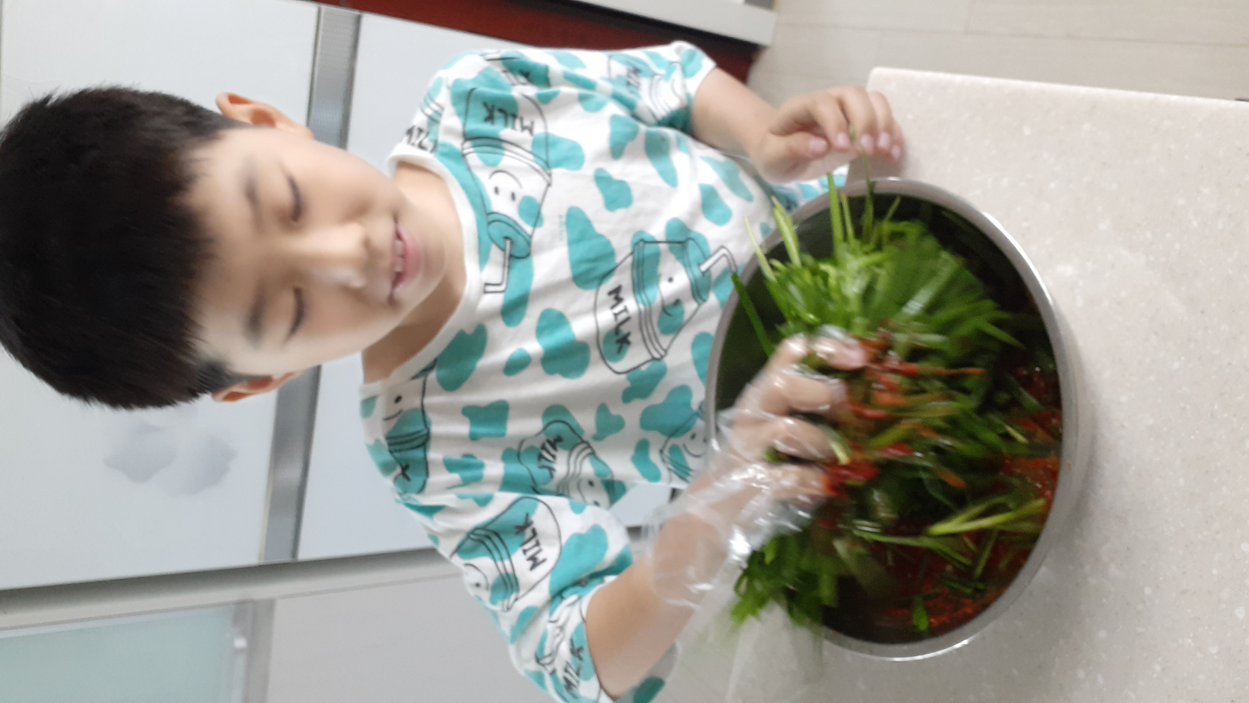 샘표 쿠키상 받아서 아들과 함께 부추김치 담궈봤어요.. 진짜 간편하게 양념소스와 물.고추가루.부추만 있으니 간단한 부추김치가 뚝딱 완성되었어요.. 초2아들도 무치는게 재밌어서 즐겁게 반찬 만들었어요.. 편식 있는 아이인데 스스로 만든거라 조금 먹어보면서 맛나다고 이야기하더라구요^^