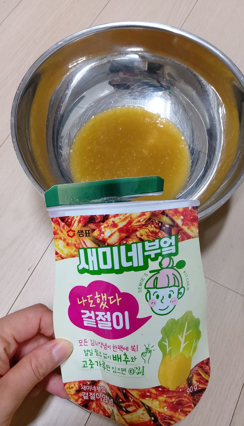 안에 이렇게 노란 양념이 있어요~마늘냄새가 달달하게 나네요~