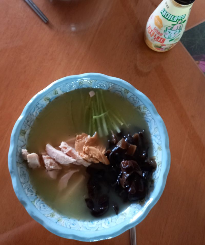 불린 목이버섯1개, 닭가슴살1/2개,정식품채소육수300ml,오이1/6개,땅콩버터1T,새미네닭가슴살겨자냉채소스1T,물
