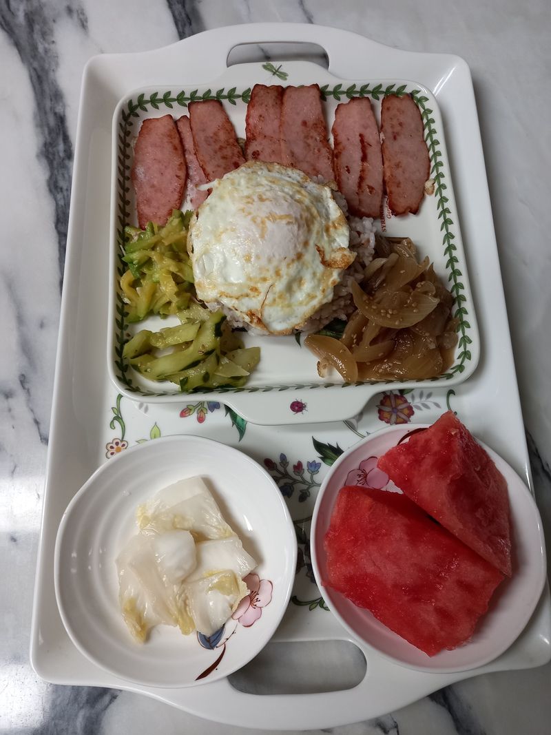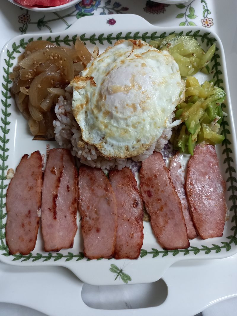 호박나물, 양파볶음,오이나물에 오븐그릴햄, 후라이하나 올린 한접시요리