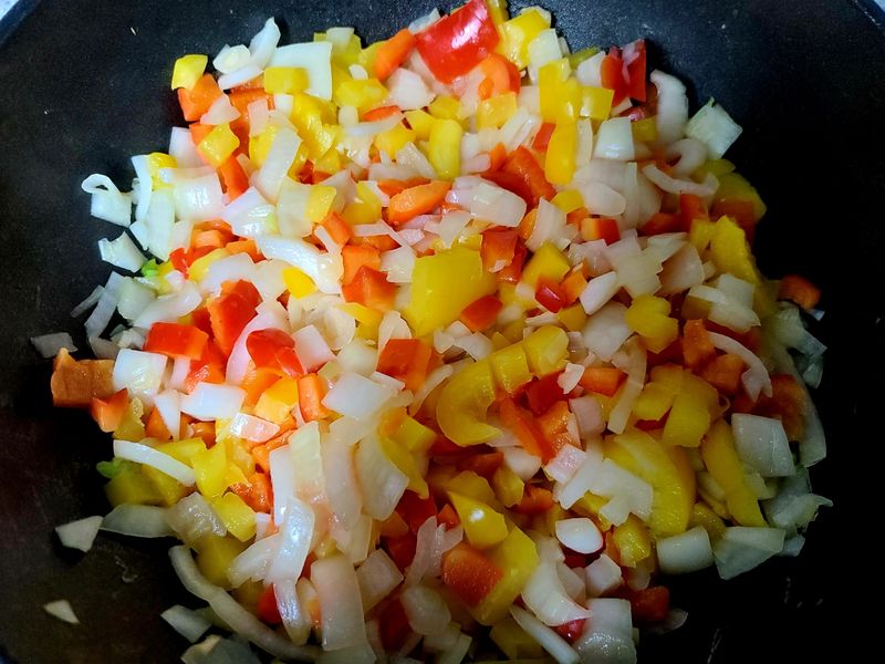 (1) 집에 있는 채소를 썬 후 잘 볶아줍니다.
