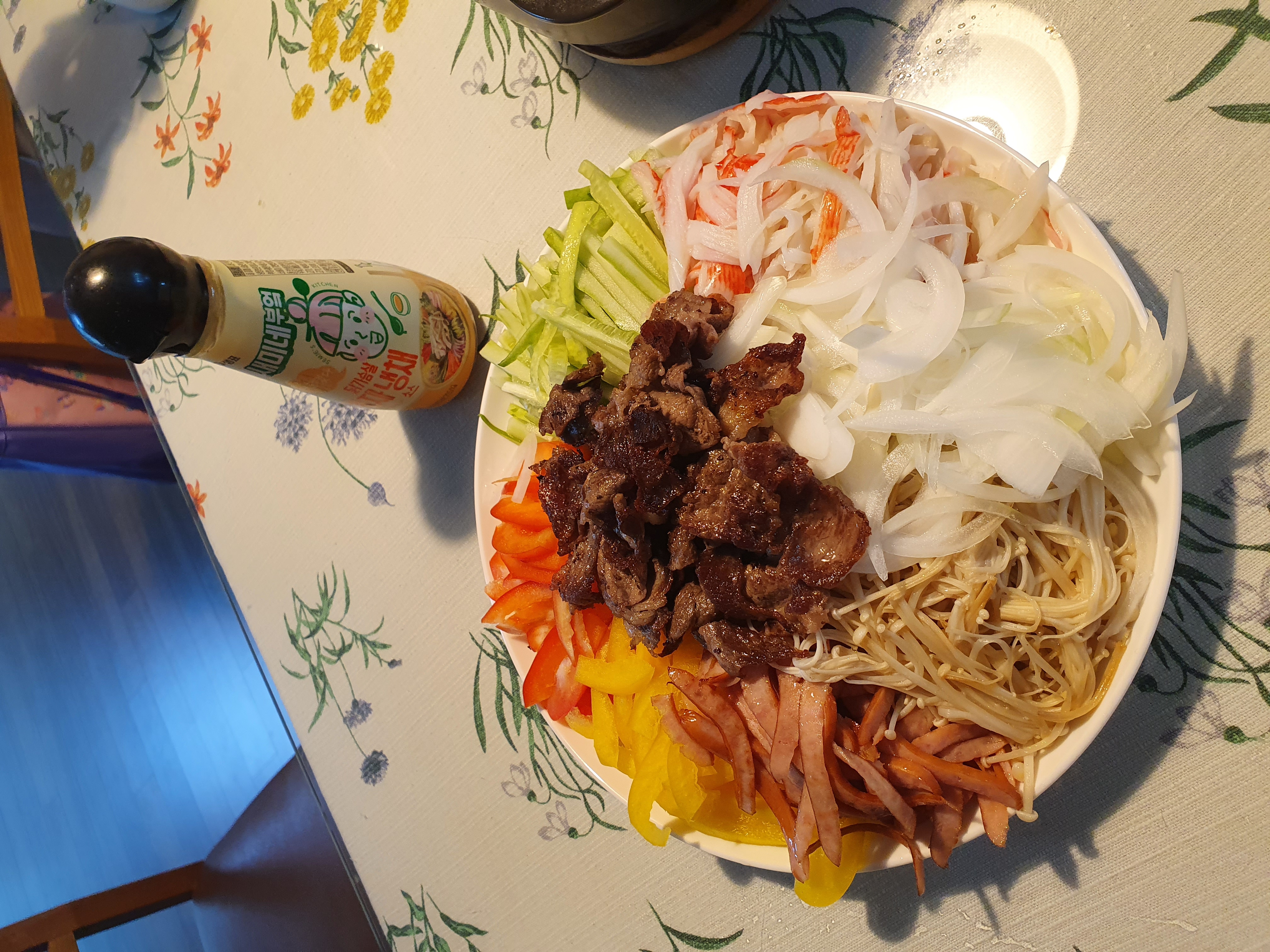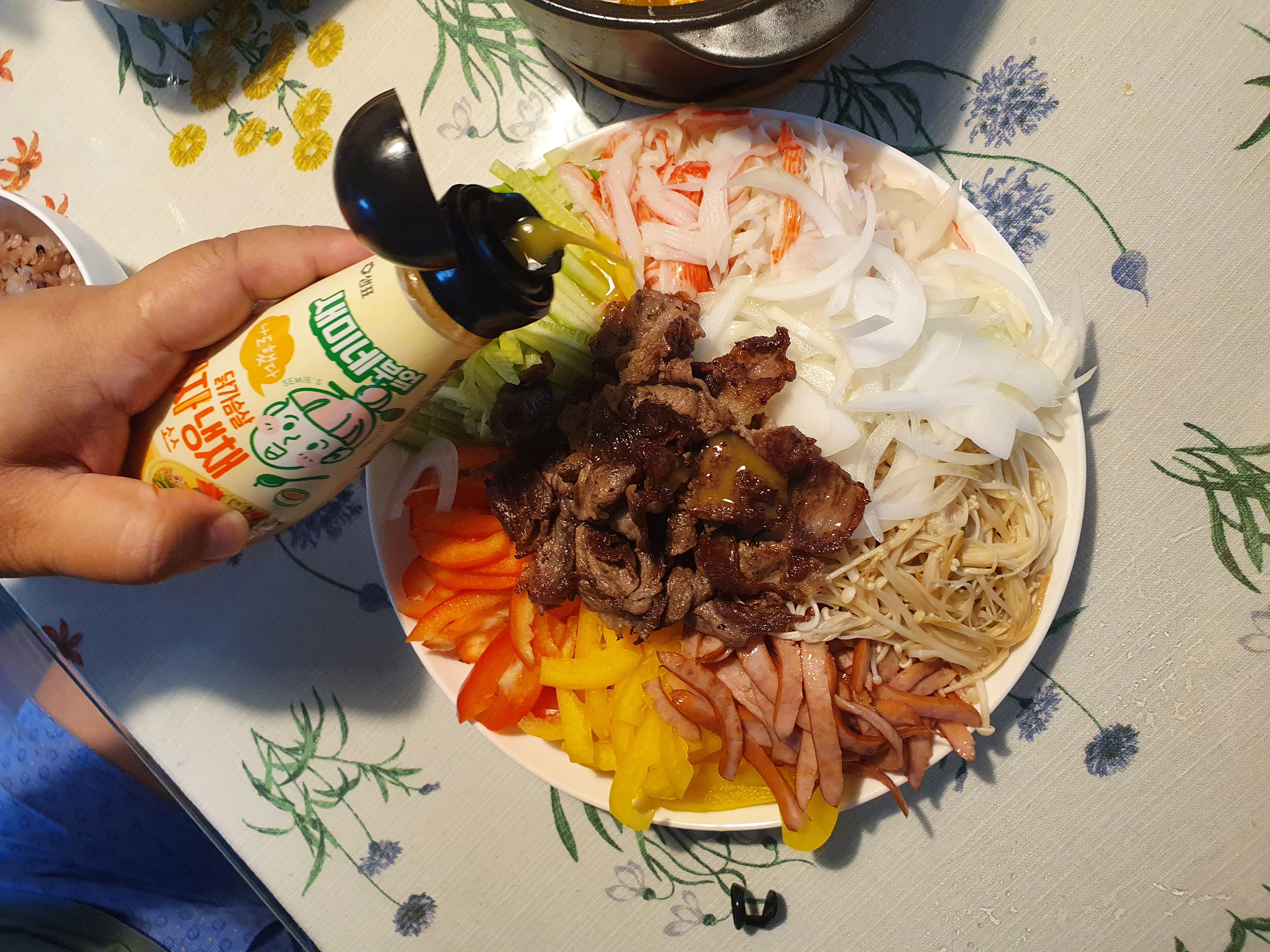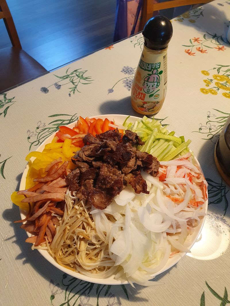 살이 5키로나 쪄서 운동 중인데 운동하고 오니 너무 배가 고프더라구요. 탄수화물은 안되겠다 싶어 마트가서 차돌냉채 재료 사고 소스는 샘표에서 나온 닭가슴살 겨자냉채 소스 사서 후딱 만들었어요.