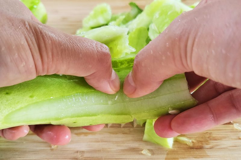 오이에 돌기가 많을 경우, 칼끝으로 가볍게 스치듯 긁어내주세요.