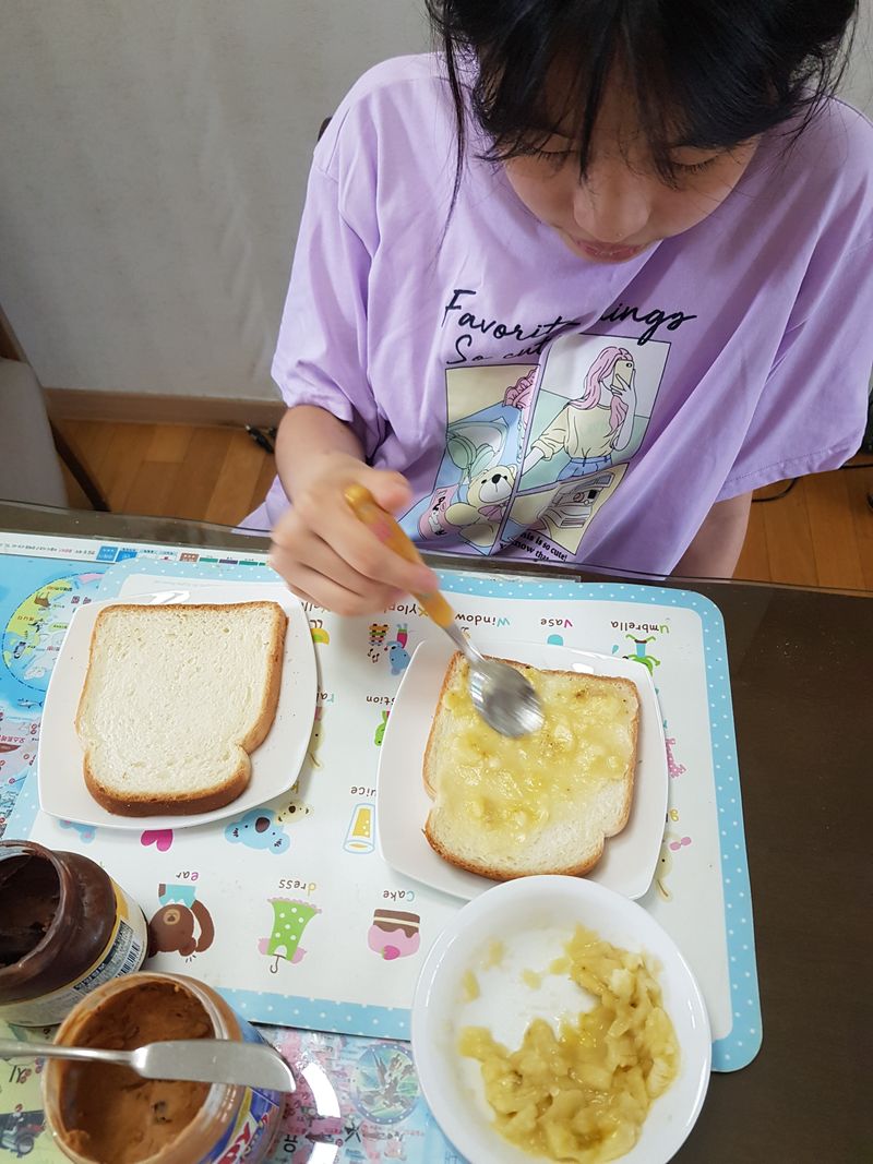 방학이 길고길지만 삼시세끼는 먹어야하고 간단하게 샌드위치 해먹어요 식빵 한쪽은 땅콩버터..한쪽은 으깬 바나나 바르고 겹쳐서 계란물 입혀 구우면 고소하고 부드럽고 아이들도 잘먹어요