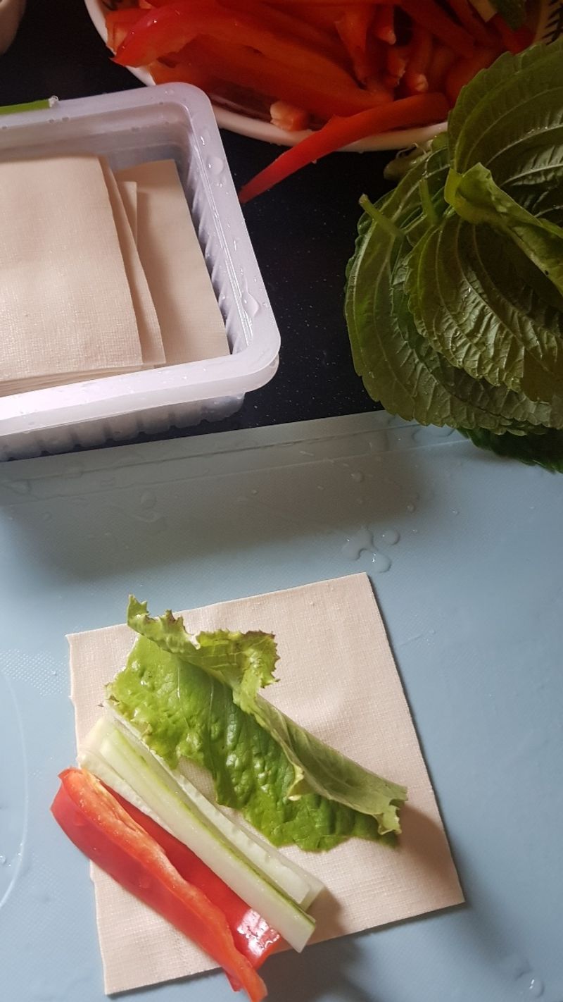 포두에 적당한 크기로 자른 야채 올려주고 말아주기만 하면 완성