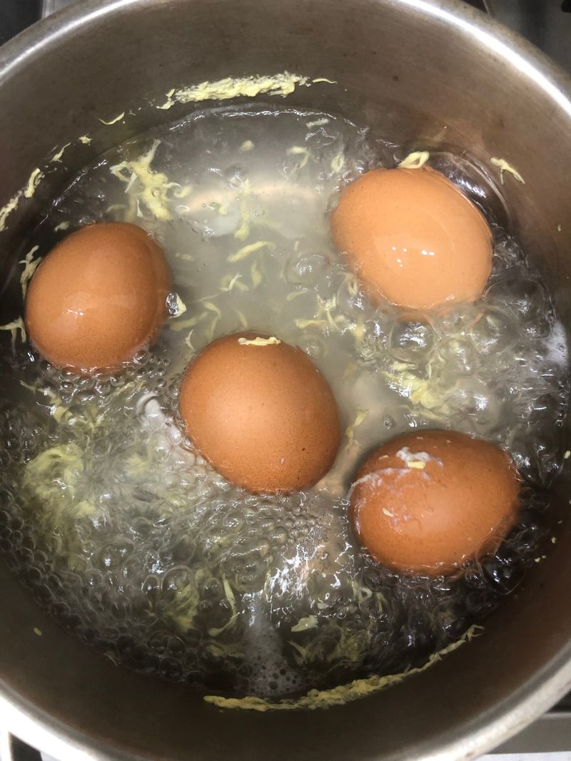냉장고에 보관해있던 달걀이 너무 차가우면 끓으면서 달걀껍질이 얇은 부분이 균열이 가고 깨 질수 있어요.