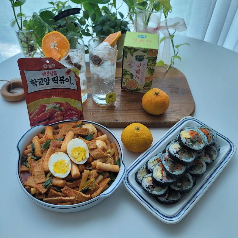 매콤한 떡볶이와 함께 순작 청귤차를 얼음이랑 탄산수에 섞어주니 탄산음료 대신 잘 마시네요.